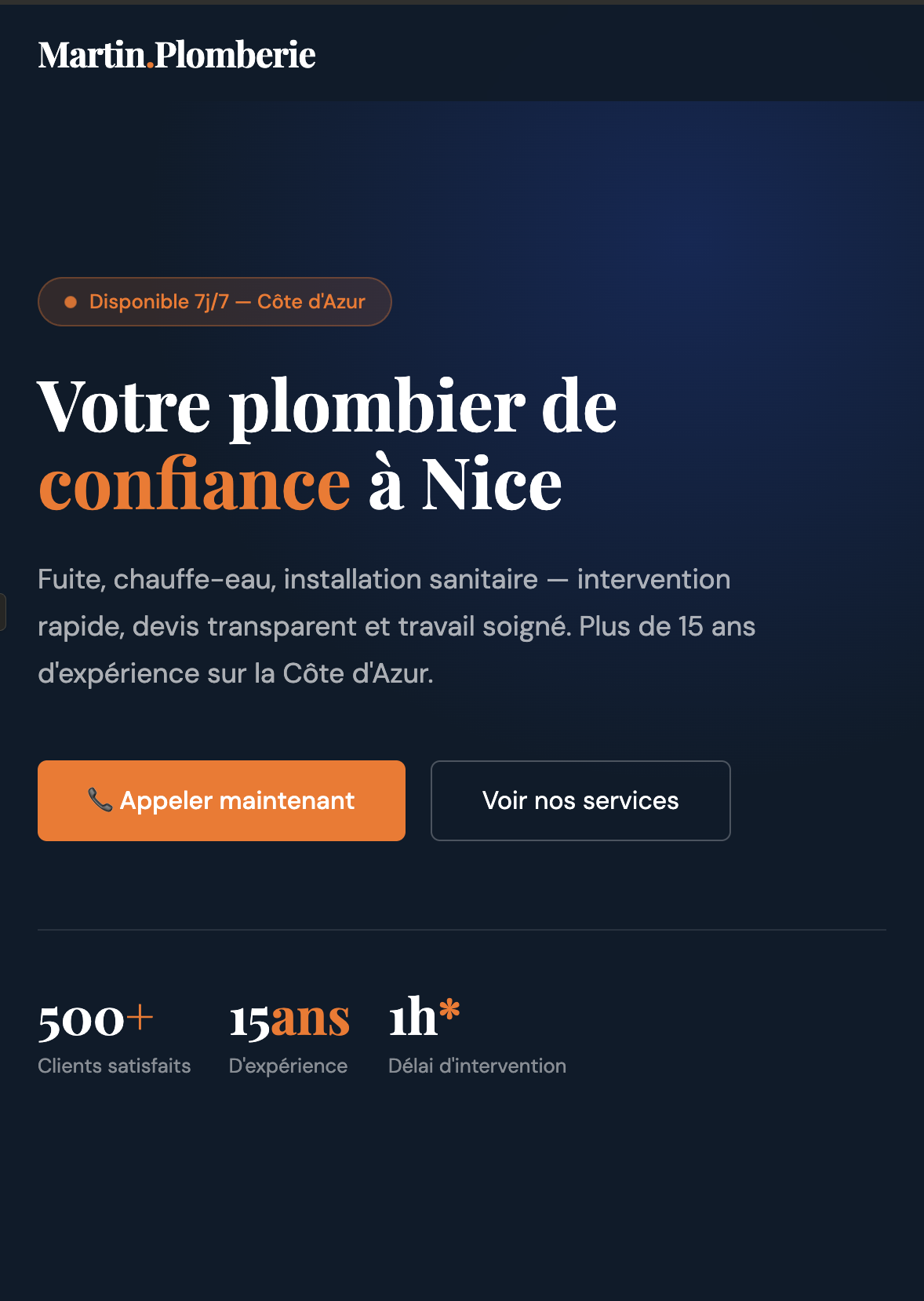 Vous êtes artisan, commerçant ou indépendant et vous n'avez pas encore de site web — ou votre site actuel ne vous représente plus ? Je vous livre un site vitrine professionnel, rapide et optimisé pour Google, en seulement 7 jours ouvrés. Chaque site est créé entièrement sur-mesure, sans template générique. Ce que vous obtenez : — Un design unique adapté à votre activité et vos couleurs — Un site responsive (parfait sur mobile, tablette et ordinateur) — Un formulaire de contact fonctionnel — Une mise en ligne complète incluse — Un site optimisé pour apparaître sur Google dès le lancement Pourquoi me choisir ? Je suis micro-entrepreneur spécialisé dans la création de sites web pour les TPE et artisans. Sites créés sur-mesure avec les dernières technologies web. Je travaille vite, je communique clairement et je livre ce que je promets. Ce dont j'ai besoin pour démarrer : — Votre logo (ou je crée une version simple) — Vos textes et photos (ou je vous aide à les rédiger) — Vos couleurs et préférences visuelles Des questions ? Contactez-moi avant de commander, je réponds en moins d'1h.