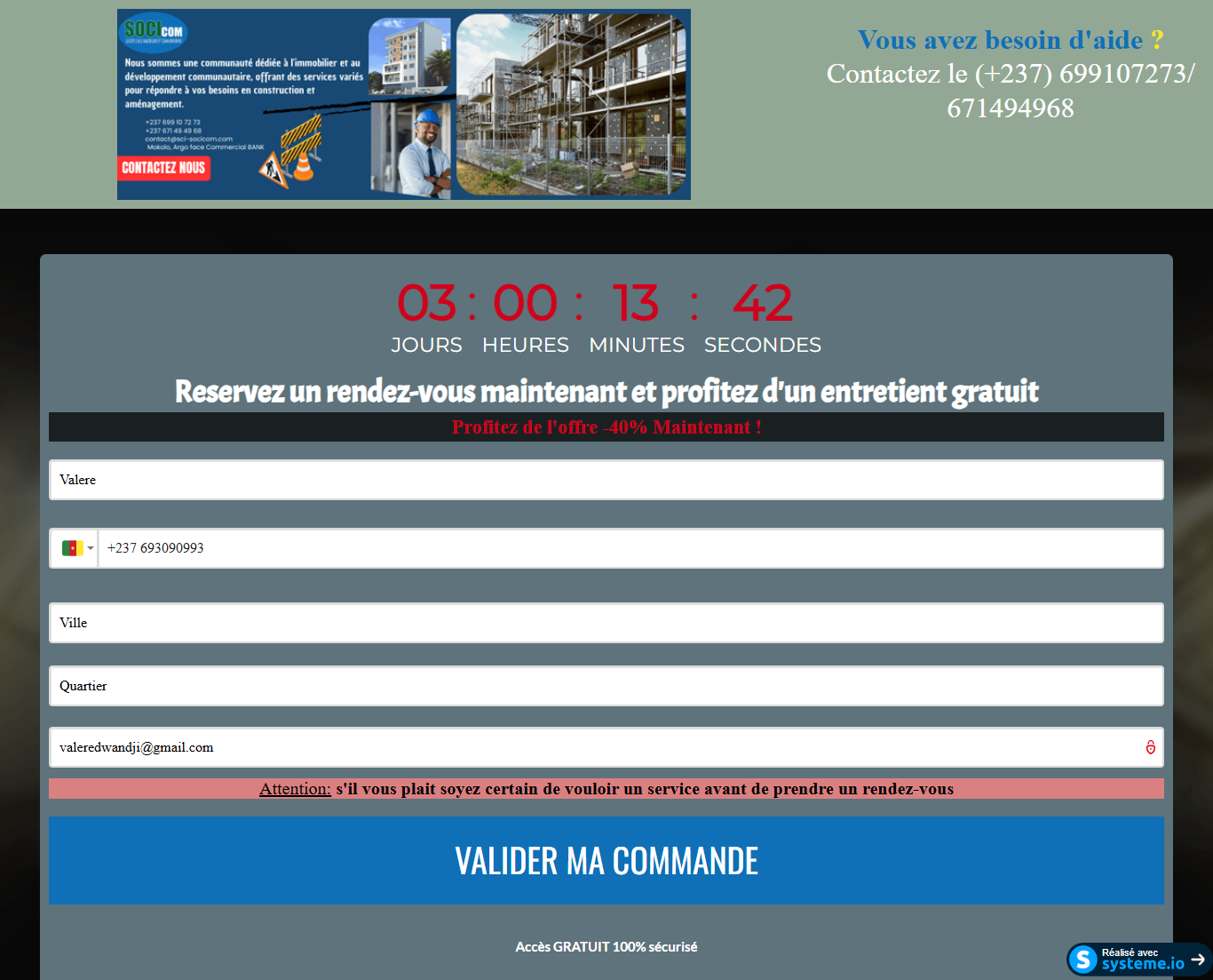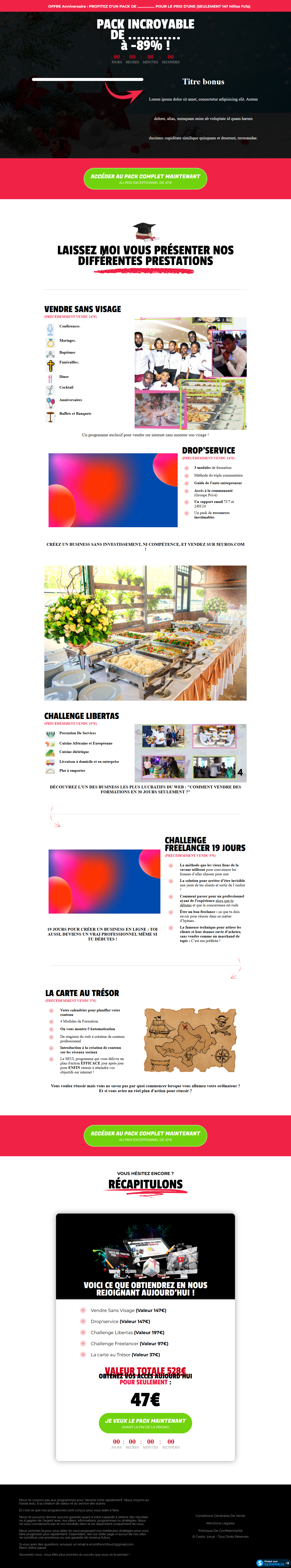 Nous sommes l’ultime solution pour vous permettre d’atteindre vos objectifs. En effet, nous ne faisons pas que vous créez des pages web, tunnels de vente, fiches produits ou des séquences emails… Nous savons que vous souhaitez réellement c’est générer plus d’argent et faire passer votre business à un autre palier. Nous en sommes conscients et nous travaillons de sorte à ce que tout investissement que vous ferez sur nos services vous soit rentable à long terme. Nous travaillons sur votre projet comme s’il était le nôtre… Car votre satisfaction est l’essence même qui fait croitre notre entreprise. Avec 3 ans d’expériences en ingénierie logiciel et 04 ans d’expériences en marketing digital…Je saurai vous conseiller les meilleures stratégies digitales, les systèmes de conversion adéquate et enfin vous accompagner dans la réalisation. LES SERVICES QUE VOUS POUVEZ AVOIR SUR MON COMPTE ✅Conception de tunnel de vente clé en main et optimisé sur système.io : ✔️élaboration de la stratégie marketing qui permet d’atteindre vos objectifs de vente ; ✔️étude de votre projet et création d’offres irrésistibles ; ✔️élaboration d’une échelle de valeurs pour vos produits et services ; ✔️ responsive design et pages web professionnel ; ✔️Paramétrage avancé (segmentation avec les tags, campagne d’email) et automatisation ; ✔️Configuration callendy ; ✔️installation de pixel Facebook et de preuves sociales ; ✔️accompagnement et suivi complet. ✅Création des boutiques Shopyfy et Youcan : ✔️Configuration ; ✔️Conception fiche produit ; ✔️Creation de logo et page de couverture; ✔️creation des images gifs ; ✔️rédaction de vos fiches produits avec la méthode SONCAS