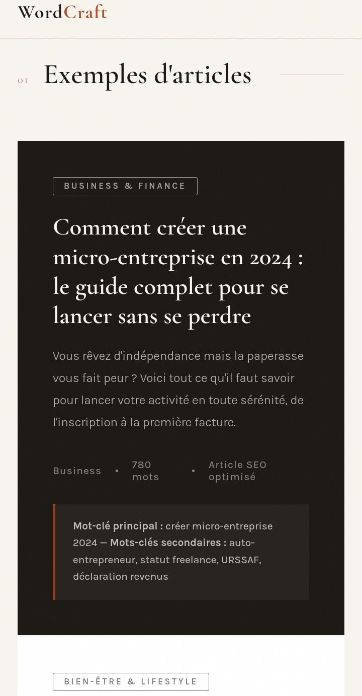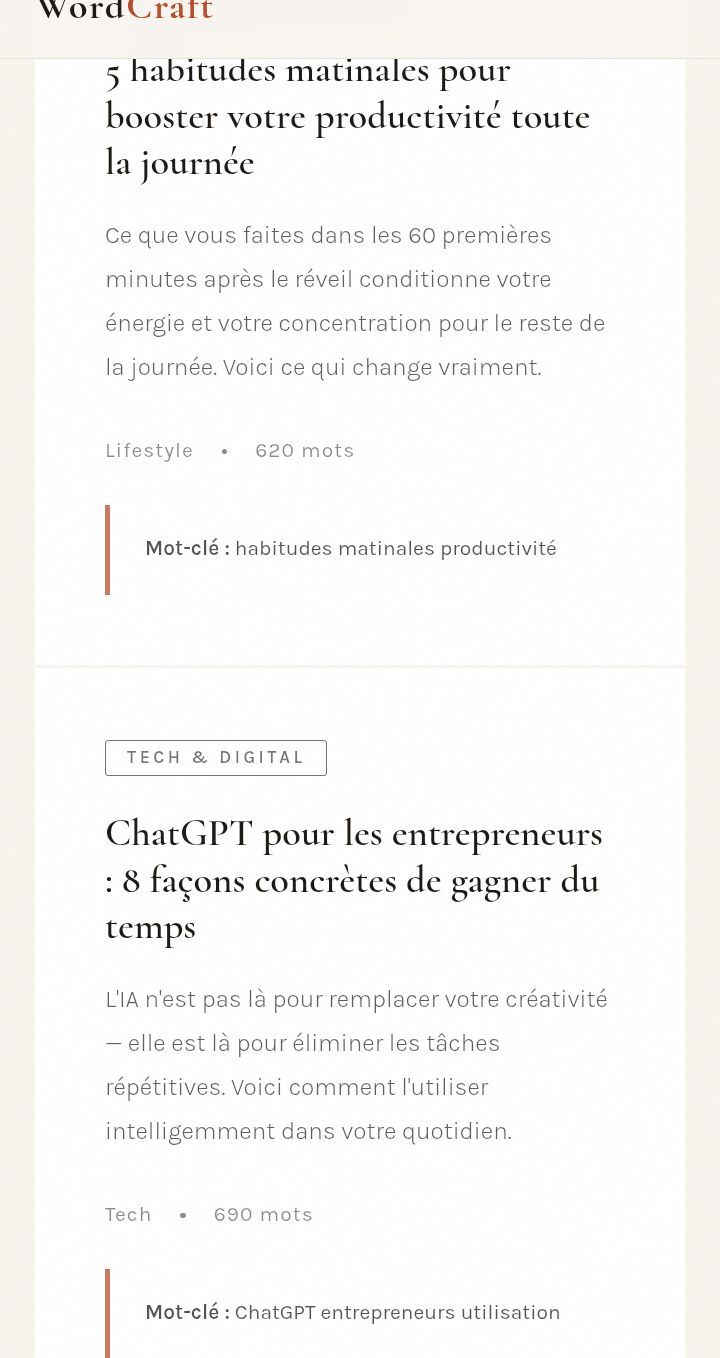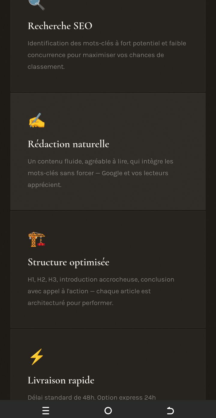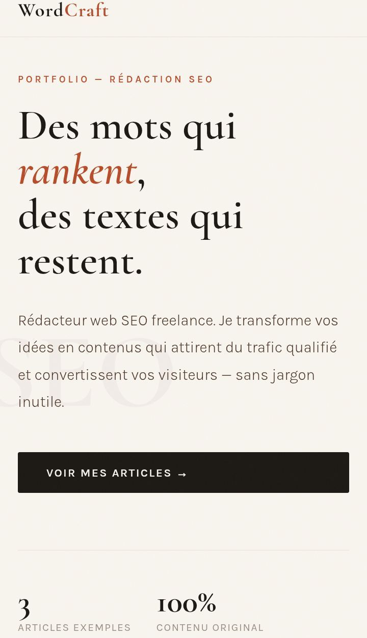 Rédacteur web SEO — j'écris des articles optimisés Google qui attirent du trafic et se lisent vraiment. Blogueurs, e-commerces, entreprises : je transforme vos idées en contenus qui rankent.