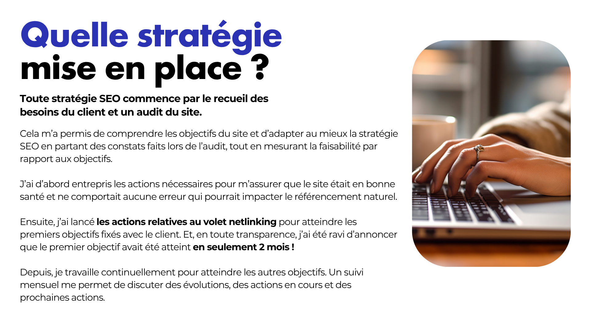 👉 Des stratégies personnalisées : Chaque projet a ses propres défis et opportunités. Mon approche consiste à comprendre vos besoins spécifiques et à élaborer des solutions SEO adaptées pour maximiser votre rentabilité.