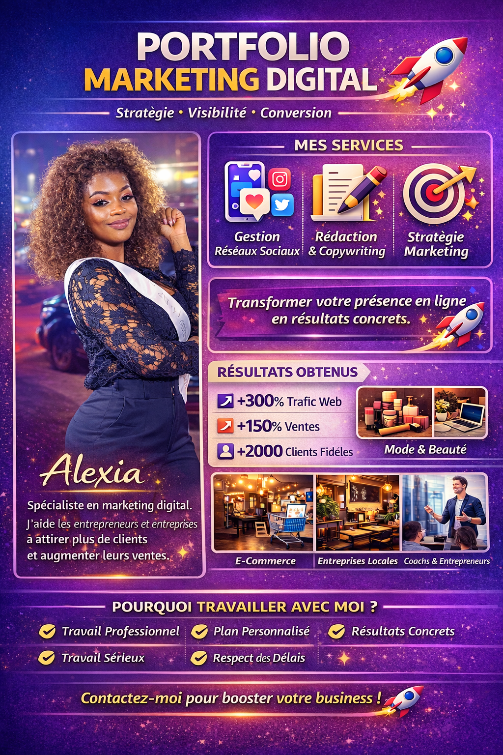 ✔️ Création et optimisation de contenu pour réseaux sociaux ✔️ Rédaction de textes publicitaires qui convertissent ✔️ Stratégie marketing personnalisée ✔️ Optimisation de votre image de marque ✔️ Analyse et amélioration de vos performances ✔️ Accompagnement pour attirer des clients locaux et internationaux