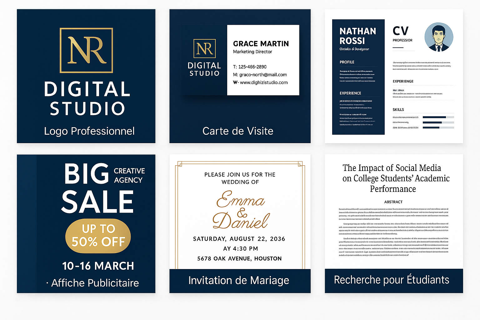 Nous réalisons : ✨ Logos professionnels ✨ Affiches publicitaires ✨ Cartes de visite & cartes de mariage ✨ CV modernes et attractifs ✨ Montages photo ✨ Recherches documentaires pour étudiants ✨ Mise en page de documents