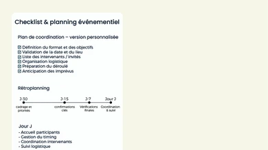 Je vais structurer l'organisation de votre événement avec un plan clair et professionnel