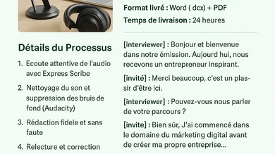 Je vais faire la transcription rapide et soignée de vos audio et vidéo