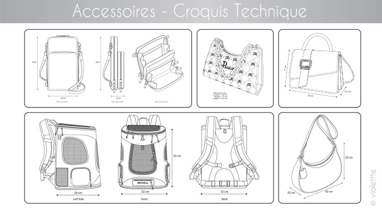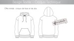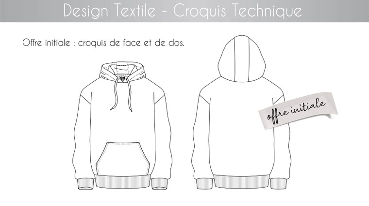 Croquis de face et de dos d’un produit en noir et blanc.