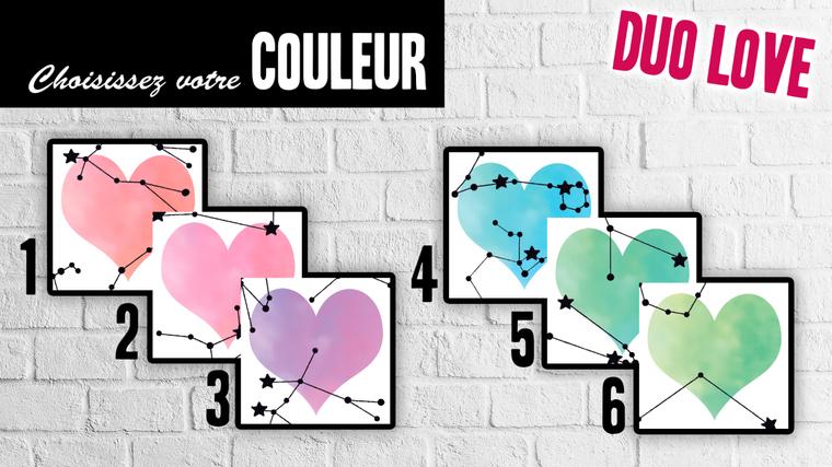 ••• la couleur souhaitée ••• 2 couleurs au choix pour le modèle SOLO (bleu/vert avec les qualités au masculin ou rose/violet avec les qualités au féminin) et 6 couleurs au choix pour le modèle DUO LOVE, sans option supplémentaire !