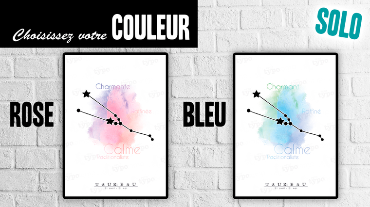 Pour seulement 17,54 $US, je vous envoie l'affiche SOLO de votre signe astrologique en version Homme (bleu/vert) ou Femme (rose/violet), avec le nom du signe et votre date de naissance et/ou le prénom que vous m'aurez indiqués.