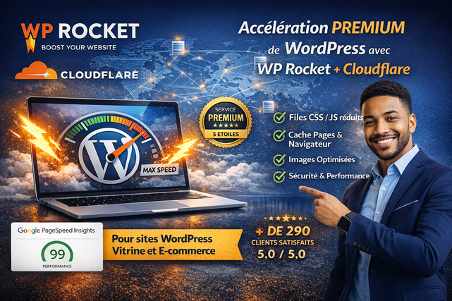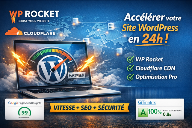 Je vous propose une optimisation professionnelle de la vitesse de votre site WordPress grâce à une configuration avancée de WP Rocket + Cloudflare CDN, utilisée par les sites performants et les e-commerces à fort trafic.