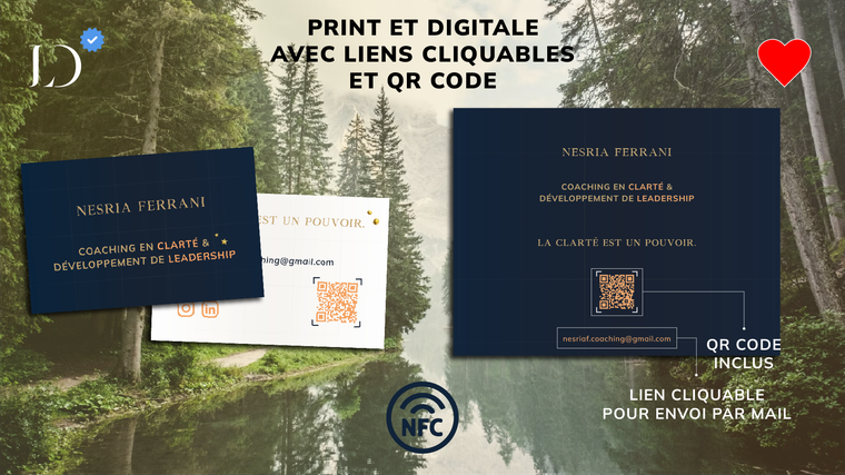 Si pour vous le papier c'est dépassé et que vous aimeriez envoyer vos cartes de visite par sms, Whatsapp, mail, Telegram... Laissez-moi vous fournir votre carte design et interactive en format PDF, sur laquelle vos contacts pourront cliquer simplement dessus pour avoir accès à vos réseaux, votre site, votre numéro/mail... Prenez l'option "Votre carte digitale" ci-dessous et laissez-moi m'en charger ;)