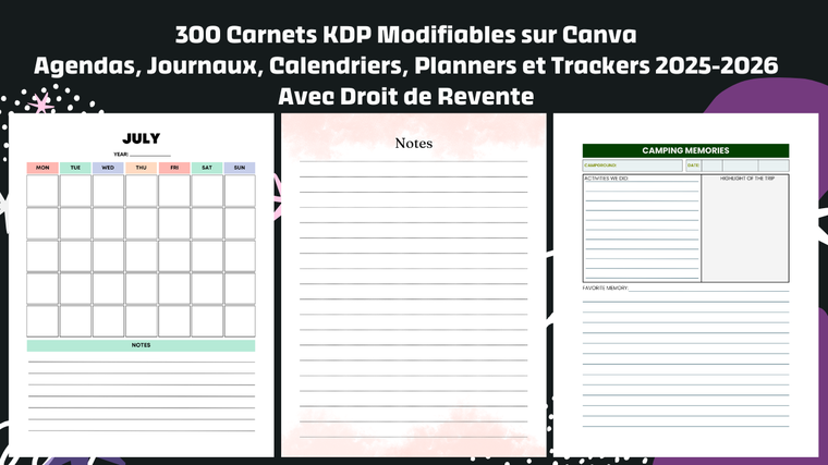 a) Vous recevez 300 carnets prêts à publier et modifiables sur Canva.