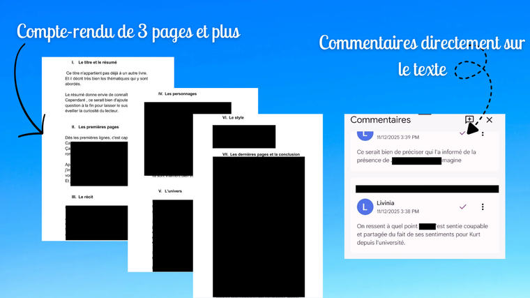 - Des commentaires directement sur votre texte,