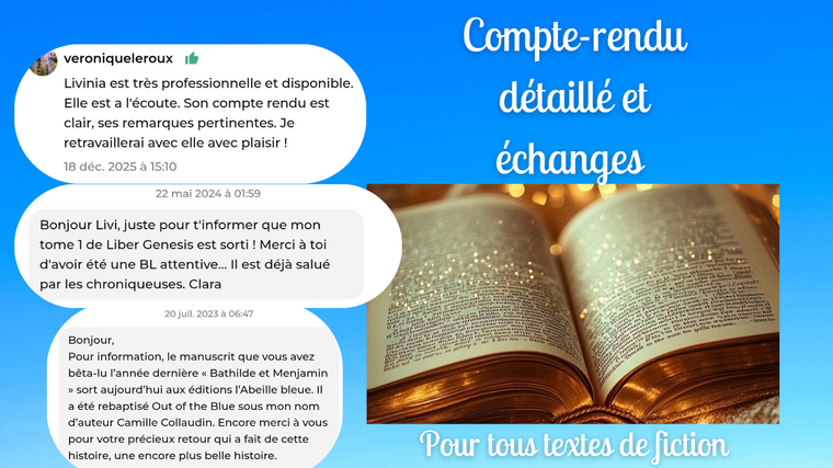 Ps : Je n'accepte que 3 commandes par semaine afin de lire et analyser votre roman au mieux.