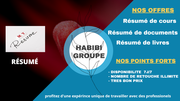 Nous sommes un groupe d'entrepreneurs spécialisé dans de divers domaines de rédaction. Pour ce service, nous mettons à votre disposition nos compétences afin de vous aider à obtenir des résumés de qualité de vos textes.