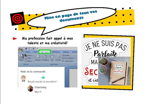 Plus de dizaines d'années en opératrice de saisie, la mise en page ne me pose aucun problème. Depuis la couverture jusqu'à la table des matières: Titre, sous-titre, numérotation, caractères, symboles, puces, marges, disposition de la page, entête et pied de page, notes, pagination,...