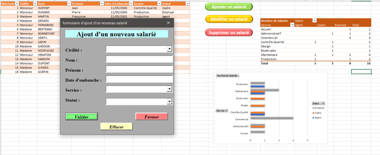 Vous souhaitez ajouter des formules, mettre en place un formulaire de saisie automatisé, insérer des graphiques et même créer un tableau croisé dynamique, je m’engage à vous le fournir.