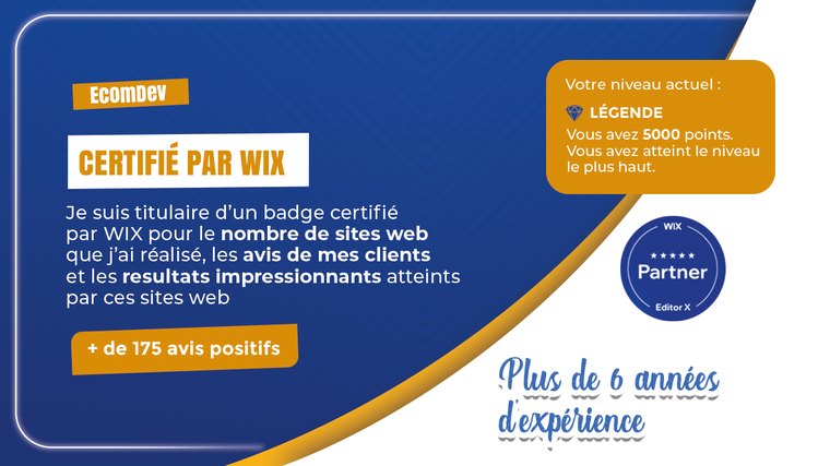 | Je suis titulaire d'un badge de concepteur de sites web certifié par WIX pour avoir réalisé plusieurs dizaines de sites web qui ont atteint des résultats impressionnants. |