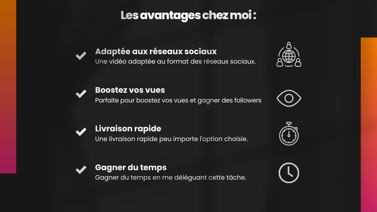 💼 Professionnalisme assuré : Avec mon expertise en création vidéo TikTok, vos extraits auront une qualité professionnelle. Du montage aux transitions, musique et effets visuels, vous obtiendrez un résultat impeccable pour impressionner votre public.
