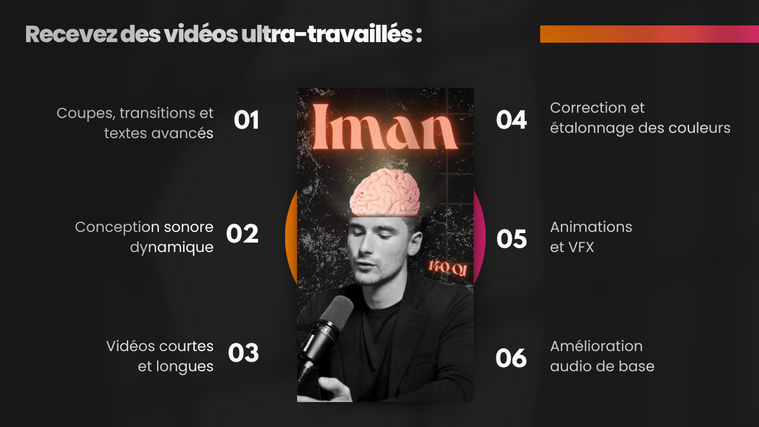 La plupart des vidéos se ressemblent, manquant d'originalité. Mon engagement est d'aller au-delà des clichés pour créer des extraits qui se démarquent véritablement, captivant votre public avec des concepts innovants et inédits.