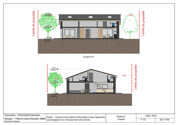 ✧Coupe de projet avec son terrain ( échelle 1/100 et emprise de sol ne dépasse pas 250 m²)