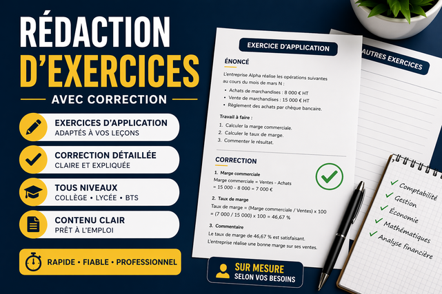 Je vais créer des exercices dapplication avec correction pour cours (comptabilité, gestion, mathématiques)