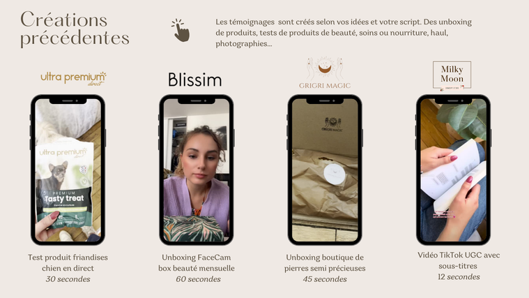 Format MP4, selfie pour des tests ou témoignages, mode caméra pour des unboxing ou tests de produits en contexte / produits animaux.