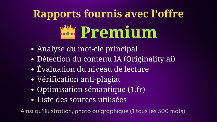 Cela demande du travail complémentaire. Et puis, les outils que nous utilisons, comme Originality.ai, ont un coût à l’utilisation. C’est pourquoi ces analyses détaillées sont incluses dans notre offre Premium. Toutefois, même dans notre ** Formule Pro**, vous obtenez un contenu rédigé par un expert humain, non généré par IA, ce qui garantit sa qualité. Vous pouvez d’ailleurs utiliser vos propres outils pour vérifier le travail fourni.