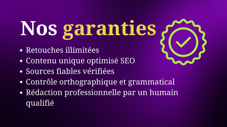 Après votre paiement et le remplissage du brief détaillé (sujet, mot-clé principal, objectif de l’article, etc.), nous entamons la rédaction. Vous recevez ensuite votre contenu dans les délais convenus, et vous avez la possibilité de demander **des retouches sans limite** pour obtenir un résultat qui vous satisfait pleinement, tant que cela respecte le brief initial.