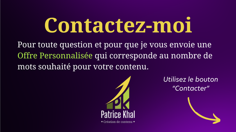 47 % des acheteurs lisent au moins 3 contenus avant de prendre une décision. Est-ce que vos articles de blog permettent réellement de fidéliser ? Vos descriptifs aident-ils à convaincre ? Depuis 2005, je crée des textes qui captivent, convainquent et convertissent. Je suis Patrice Khal, passionné par les mots et expert en webmarketing et copywriting. "Je recommande infiniment. Patrice est vraiment bon, que dis-je, EXCELLENT. Bravo !" ⭐️⭐️⭐️⭐️⭐️ Stephred_SEO Mon expérience va au-delà de la rédaction : de la poésie (des milliers d'acrostiches vendus) à un roman jeunesse (Onimundo) et un essai (21 Lois de l’Esprit Libre), en passant par des concours littéraires remportés, comme le prix de la plus belle déclaration d'amour sur Chérie FM. J'ai même eu l'honneur de porter la flamme olympique aux JO de 2004 grâce à un texte sur l'esprit sportif. La Méthode OMEGA : Former l’élite de la rédaction web Depuis 2018, je forme des rédacteurs avec ma Méthode OMEGA. Cette expertise me permet aujourd'hui de sélectionner les meilleurs talents pour mon agence, afin de vous garantir des résultats qui dépassent vos attentes. Ainsi, mon équipe et moi unissons nos compétences pour vous offrir des textes percutants et de qualité. Vous pouvez donc être sûr que chaque projet bénéficie de notre expertise. "Patrice a su, à travers ses bons conseils et son exécution, créer une page de vente qui clairement remplit la promesse de son offre. Il est clair que son expérience est bien présente et qu'il connaît les tournures qui convertissent un prospect en client." ⭐️⭐️⭐️⭐️⭐️ JMG Vous voulez des textes qui engagent, fidélisent et plaisent à Google ? Cliquez sur le bouton Me contacter et discutons de vos besoins dès aujourd’hui.