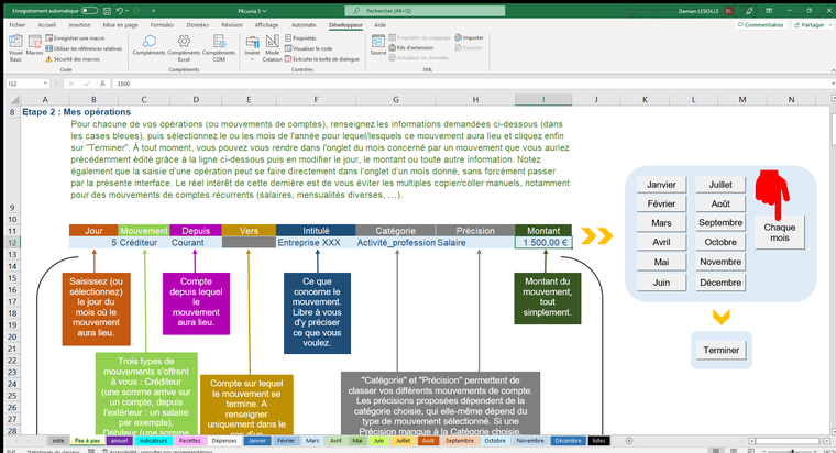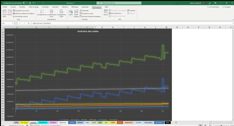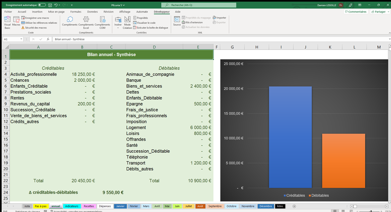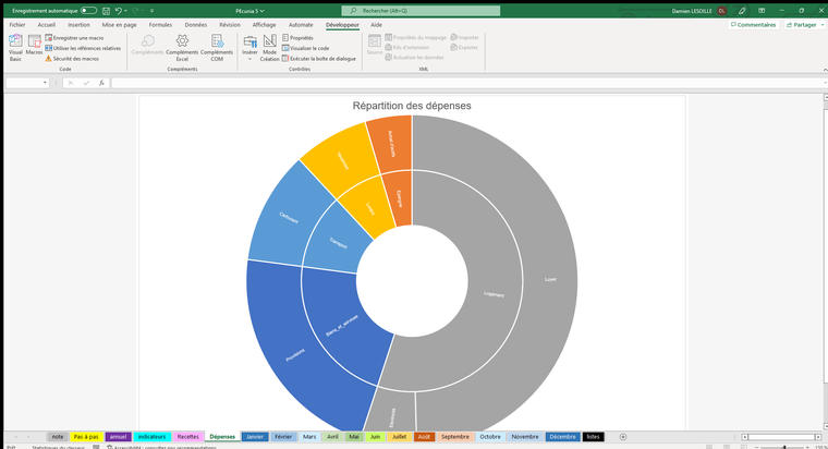D’autre part, ce fichier permet une bonne visibilité, sur l’année entière, de vos recettes et dépenses, de façon synthétique comme dans le détail, de manière chiffrée et graphique. Prendre du recul peut parfois s’avérer utile pour distinguer l’essentiel du superflu.