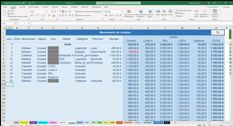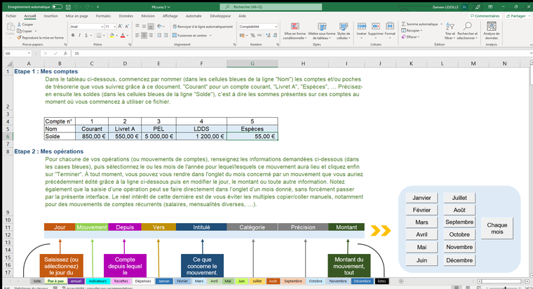 Ce tableur vous permettra de gérer jusqu’à 8 réserves de trésorerie (compte courant, livret A, espèces, …) sur un seul et même fichier.