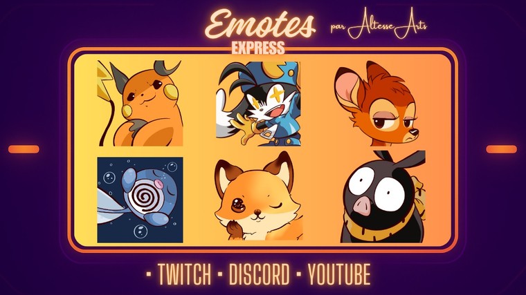 Qu'à cela ne tienne, je vous propose de réaliser vos emotes / émoticônes afin d'embellir et de personnaliser votre chaîne de vidéaste ou de streameur afin que celle-ci sorte du lot. Vos abonnés pourront grâce à elles s'amuser à vous embêter en vous assaillant de leurs réactions à chaud mais aussi et surtout inonder vos lives d'emotes uniques en leur genre !