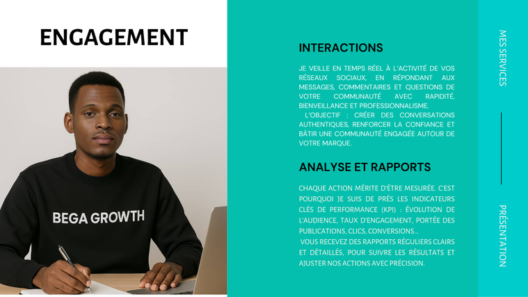 *Nous collaborerons avec vous pour comprendre vos objectifs et mettra en place une stratégie de contenu efficace pour vous aider à atteindre vos objectifs. Nous assurerons une interaction quotidienne avec votre public pour augmenter l'engagement et la portée de votre compte. Nous identifierons les influenceurs et les partenaires pertinents pour étendre votre audience. Nous analyserons en continu les performances pour suivre les résultats de votre campagne.*