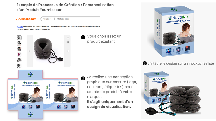Cette offre repose sur l’utilisation d’un mockup existant (modèle vierge), qui est ensuite adapté au produit du client. Le mockup est ajusté afin de correspondre au format et à l’apparence générale du produit, et le design ou les étiquettes fournis par le client y sont intégrés. Le rendu final est livré en format PNG ou JPG, sur fond blanc ou sans fond, prêt à être utilisé sur une page produit e-commerce. Deux retouches sont incluses et le délai de livraison est de 3 jours.