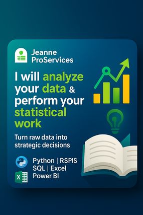 👋 Bonjour et bienvenue sur mon profil ! Je suis Jeanne, Data Analyst, statisticienne et rédactrice polyvalente. Depuis plus de 4 ans, j’aide étudiants, entrepreneurs et entreprises à donner du sens à leurs données, à automatiser leurs processus et à valoriser leurs travaux avec clarté et professionnalisme. Je crois qu’un service de qualité ne doit pas être hors de prix 💡 👉 Mes prestations sont accessibles, précises et rapides, avec un suivi humain et bienveillant à chaque étape. 🎯Ce que je fais pour vous 📊 Analyse de données et statistiques Études complètes sur Excel, Python, RStudio, SPSS, SQL Analyses descriptives, régressions, tests d’hypothèses, ACP, séries temporelles Visualisation et tableaux de bord Power BI / Excel automatisés ⚙️ Automatisation Excel & gestion de données Macros VBA, calculs automatiques, tableaux de bord dynamiques Nettoyage, saisie et structuration de bases de données Automatisation via Excel, Google Sheets, ou intégration Power BI 🧾 Recherche documentaire & rédaction académique Revue de littérature et synthèse sans plagiat Mémoire, thèse, rapport, étude qualitative ou quantitative Résultats clairs, méthodologie rigoureuse et références académiques fiables 🧑💻 Assistance virtuelle & gestion administrative Saisie de données, gestion de mails et d’agendas Conception de tableaux de suivi et budgets automatisés Création de présentations PowerPoint et reporting visuel 🔍 Pourquoi mes clients me choisissent ✅ Polyvalence unique : Je maîtrise à la fois la statistique, la data science, la rédaction et la bureautique avancée. ✅ Tarifs abordables : Des prestations professionnelles adaptées à tous les budgets. ✅ Livraison rapide : La plupart de mes projets sont livrés en 24h à 48h. ✅ Clarté & pédagogie : J’explique chaque résultat pour que vous puissiez l’utiliser concrètement. ✅ Fiabilité & confidentialité : Je traite chaque mission comme si c’était la mienne. 🧠 Outils & compétences techniques 📈 Logiciels & langages : Excel, Power BI, SPSS, RStudio, Python, SQL 📊 Data Management : nettoyage, fusion, automatisation, visualisation 📝 Rédaction : académique, professionnelle, synthèse documentaire 🧮 Automatisation : macros VBA, scripts Python, dashboards dynamiques ** 🎓 Parcours & certifications** 🎓 Diplômée en Statistique (ENEAM) 📚 Formations certifiées sur OpenClassrooms, Google, Coursera 🏆 Spécialiste en Data Science, Analyse de données et Business Intelligence 🌟 Mes valeurs 💬 Simplicité & proximité : je travaille main dans la main avec mes clients. ⚡ Efficacité & précision : chaque projet est traité avec rigueur et méthode. 💚 Accessibilité & bienveillance : mes services sont pensés pour tous les budgets. 🚀 Innovation & résultat : j’utilise la technologie pour simplifier la vie de mes clients. 💼 Mes services les plus demandés Analyse de données et statistiques (Python, R, SPSS, Excel) Automatisation Excel et Power BI (VBA, formules, TCD, tableaux de bord) Web scraping et collecte de données sur mesure Recherche documentaire et rédaction de synthèses Création de formulaires Google Forms / KoboCollect Assistance virtuelle & saisie de données Présentations PowerPoint et rapports visuels professionnels 🤝 Pourquoi travailler avec moi ? 🌟 Vous cherchez un service professionnel, rapide et humain ? 🌟 Vous voulez un accompagnement clair, sans jargon technique ? 🌟 Vous voulez des résultats concrets à prix juste ? Alors vous êtes au bon endroit. 📊 Ensemble, nous allons transformer vos données en décisions, vos idées en actions, et vos projets en réussites. 📩 Contactez-moi dès aujourd’hui pour discuter de votre projet. Je serai ravie de vous proposer une solution personnalisée, efficace et abordable. ✨ Jeanne_ProServices — L’expertise accessible à tous.