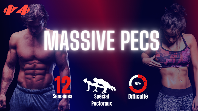 **Programme focus sur les pectoraux**Voici un programme spécifique **pour des pectoraux massifs et sculptés** comme jamais ! Grâce à des exercices ciblés et à des techniques avancées, Massive Pecs donne des résultats remarquables en termes de forme et de symétrie.