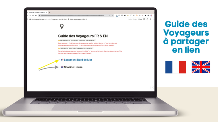 - Le guide des voyageurs pour chaque location en français et en anglais : comment contacter l’hôte, le co-hôte, les numéros de téléphone indispensables à connaître, l’adresse du logement, comment récupérer les clés, les règles à respecter, les consignes particulières, le code wifi et celui de la boite à clé, comment arriver et repartir (check-in, check-out..), que faire aux alentour…