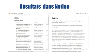 | Fonctionnement | Utilisation de Google Forms pour recueillir les informations nécessaires à la publication (par exemple, le sujet, le ton, le public cible, etc.). ChatGPT génère le contenu en se basant sur ces informations. Le contenu généré est ensuite automatiquement ajouté à une page Notion dédiée pour révision et publication. |