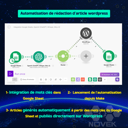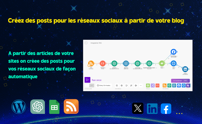 Un scénario d'automatisation avec ChatGpt, LinkedIn et WordPress peut être mis en œuvre avec Integromat pour créer une solution d'automatisation intelligente qui apporte une forte valeur ajoutée :