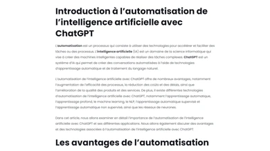 | Notre service d'automatisation avec Make et ChatGPT est conçu pour être utilisé par des personnes de tous niveaux de compétence technique. Grâce à notre expertise en automatisation Make, nous créons une interface intuitive et conviviale pour que nos utilisateurs puissent facilement accéder à toutes les fonctionnalités. Que vous cherchiez à automatiser la conversation avec ChatGPT, générer du contenu automatique pour les sites web, ou créer des scripts automatiques avec ChatGPT, notre plateforme offre une solution d'automatisation sans code avec Make adaptée à vos besoins. Avec nos services de rédaction automatique et de création de contenu automatique avec ChatGPT, même la rédaction automatique pour le contenu web devient une tâche facile et rapide. |
