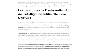 | Avantages | Gain de temps considérable, contenus cohérents et de qualité, facilité d'utilisation, processus entièrement automatisé, possibilité de générer un volume élevé de publications. |