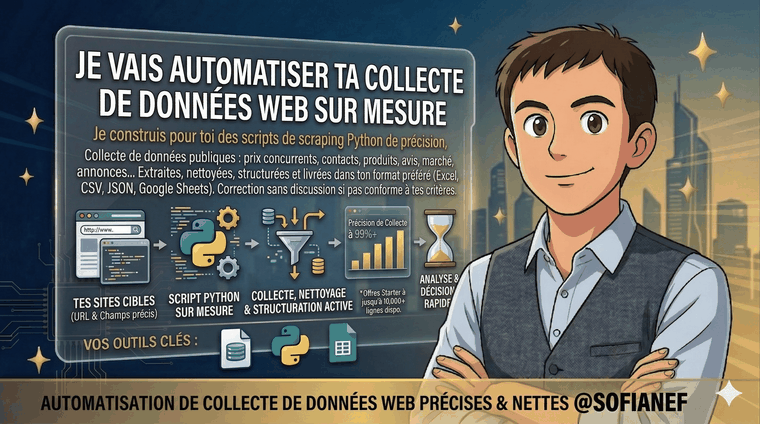 Je règle ce problème. Je code un script sur mesure qui extrait exactement ce dont tu as besoin, du site que tu cibles, dans le format que tu veux, propre et prêt à l'emploi. Pas un outil générique. Pas une solution approximative. Un script construit spécifiquement pour ton cas, tes données, ton objectif.