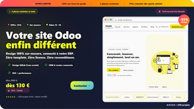 🔹 simple-entreprise.ch — Site vitrine PME complet avec CRM connecté, prise de contact automatisée et design 100% sur-mesure. Zéro template, zéro ressemblance avec un Odoo standard.