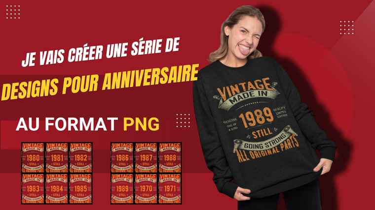Je m'engage à concevoir pour vous une série de designs d'anniversaire haut de gamme au format PNG. Si vous gérez un magasin en ligne ou une entreprise de t-shirts, vous êtes au bon endroit. Je créerai des designs d'anniversaire uniques pour chaque année, et il vous suffira de me fournir les années souhaitées. Votre satisfaction est ma priorité !"