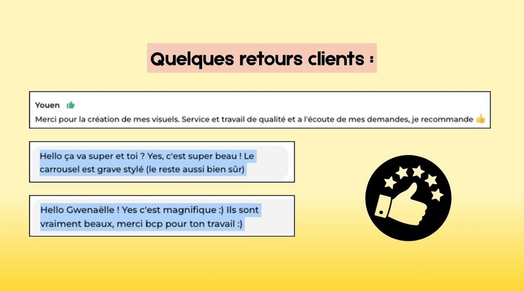 Merci pour la création de mes visuels. Service et travail de qualité et a l'écoute de mes demandes, je recommande 👍