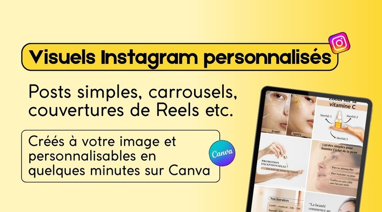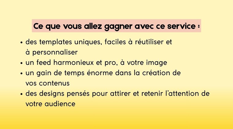 Je vous propose de créer pour vous des templates Canva totalement personnalisés à votre identité visuelle, que vous pourrez adapter librement avec vos textes, photos ou autres éléments visuels.