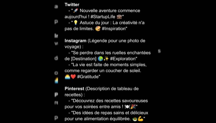 **Créativité sans limites** : Je peux apporter une touche d'originalité à chaque micro-contenu que je rédige, garantissant ainsi que votre contenu se démarque dans le flux d'informations des réseaux sociaux.