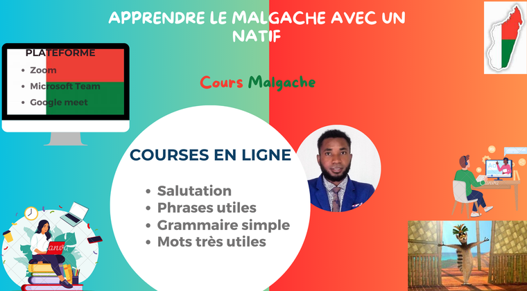 Je suis un formateur en langue malgache formé par l'organisation américaine Corps de la Paix à Madagascar, avec deux ans d'expérience dans l'enseignement de la langue malgache aux stagiaires américains. Je vous propose un cours de malgache en ligne via Zoom, Google Meet, Microsoft Teams, etc., en utilisant des présentations PowerPoint en ligne avec le partage d'écran. Vous apprendrez le malgache avec un natif expérimenté dans l'enseignement de cette langue.