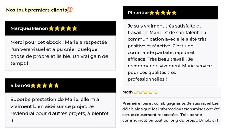 | La perfection a un nom : Marie. Je l'ai contactée pour la mise en page de mon eBook que je comptais publier à mon anniversaire. Elle a livré trois jours avant la deadline, sans qu'aucune retouche ne soit nécessaire. Elle comprend parfaitement les besoins et sait faire des suggestions très professionnelles. Il n'est donc pas étonnant qu'elle n'ait pas d'avis négatifs. Je la recommande ⭐⭐⭐⭐⭐ (5/5). |