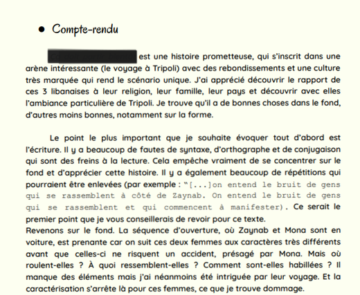Je vous fournirai un ensemble d'outils pour vous permettre de retravailler votre texte (grille de lecture, un résumé sur demande spéciale, un compte-rendu avec ses points forts et ses points faibles à retravailler et, sur option, des annotations sur texte et des pistes de réécriture) et, sur option, des pistes de réécriture. Ce rendu sera fourni au format PDF.. Ce rendu sera fourni au format PDF.
