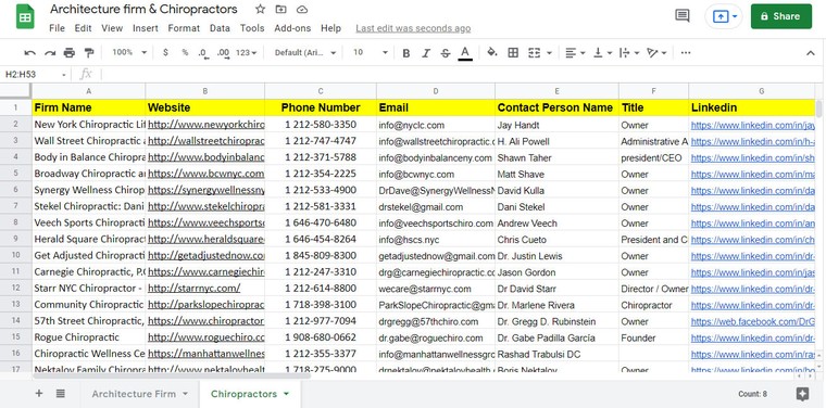 Je vérifie les informations également via des outils payants tels que Zero Bounce ou Mail tester et ensuite nous organisons les informations dans un tableau Excel, un fichier au format CSV ou au format Google Sheet.